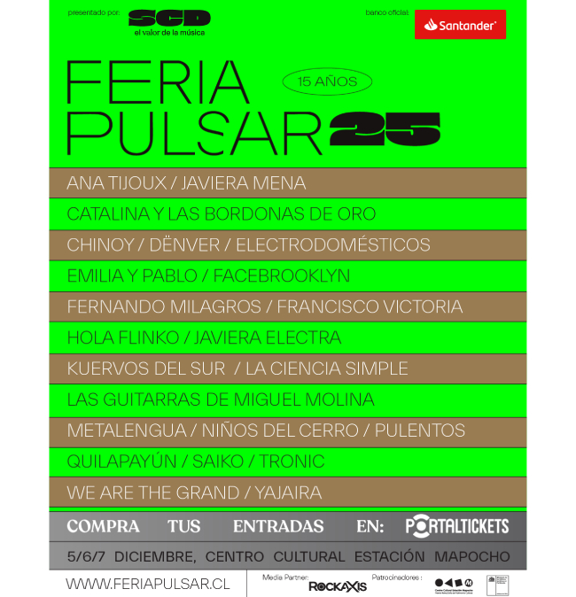 Un cartel a la altura de sus 15 años de historia, es el que ha anunciado Feria Pulsar de cara a su próxima edición, la que tendrá lugar entre el viernes 5 y el domingo 7 de diciembre en el Centro Cultural Estación Mapocho. El mayor encuentro de la industria musical local, organizado por la Sociedad Chilena de Autores e Intérpretes Musicales (SCD), tendrá así un contundente elenco de figuras nacionales, en el que destacan tanto nombres históricos como artistas que emergen con fuerza en el panorama actual.