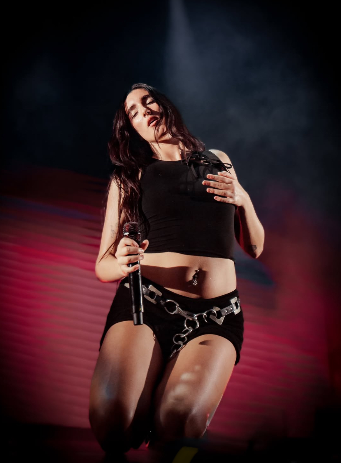 Con polera negra, estómago descubierto, short y botas vaqueras, Judeline proyectó una imagen sencilla pero con una fuerza escénica magnética. Cada movimiento de manos al estilo flamenco y el vaivén de sus caderas fue una palpitación visible de sus emociones, un lenguaje corporal que acompañó la intensidad de su voz. En su figura se concentraba el alma de Andalucía y la sensibilidad contemporánea de una artista que no teme mostrarse vulnerable.