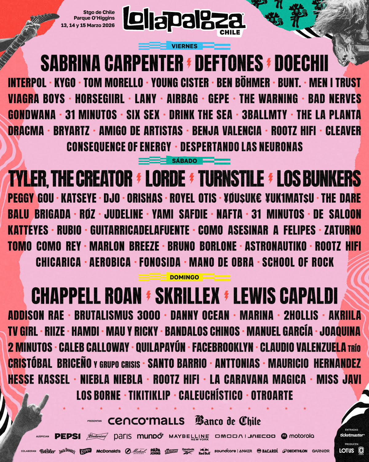El viernes 13 de marzo será encabezado por Sabrina Carpenter, artista norteamericana que se ha transformado en un fenómeno global durante los últimos años. Junto a ella estarán Deftones, agrupación encabezada por "Chino" Moreno, quienes llegarán al Parque O'Higgins para presentar su más reciente álbum Private Music (2026), además de una batería de éxitos que definieron el sonido pesado en los 2000's. En la parte alta del cartel, la icónica Doechii, quien revolucionó la industria musical por su estilo versátil que fusiona rap, R&B y pop alternativo. La oriunda de Tampa ha sido destacada como una de las voces emergentes más innovadoras de la escena actual. Interpol, Kygo, Tom Morello, Young Cister, Men I Trust, Gepe, 31 Minutos y más serán parte de aquella maratónica jornada de arranque.