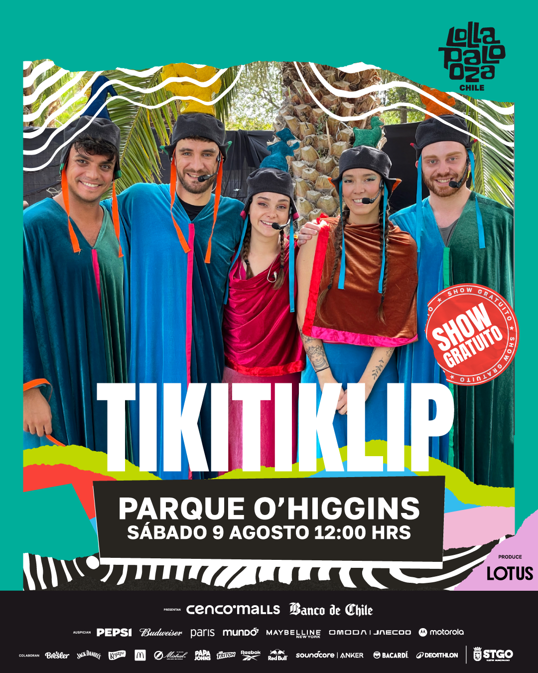 Lolla es Cultura no se detiene. Tras dos exitosas primeras fechas con Gepe y De Saloon, este sábado 9 de agosto será el turno de Tikitiklip, banda nacional que se presentará en el Parque O'Higgins con su música y colores a partir del mediodía.